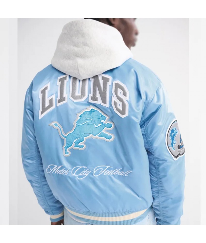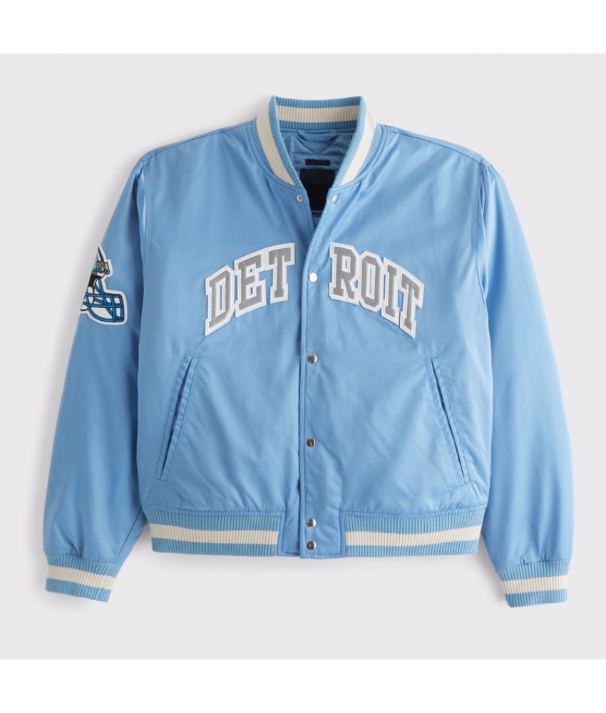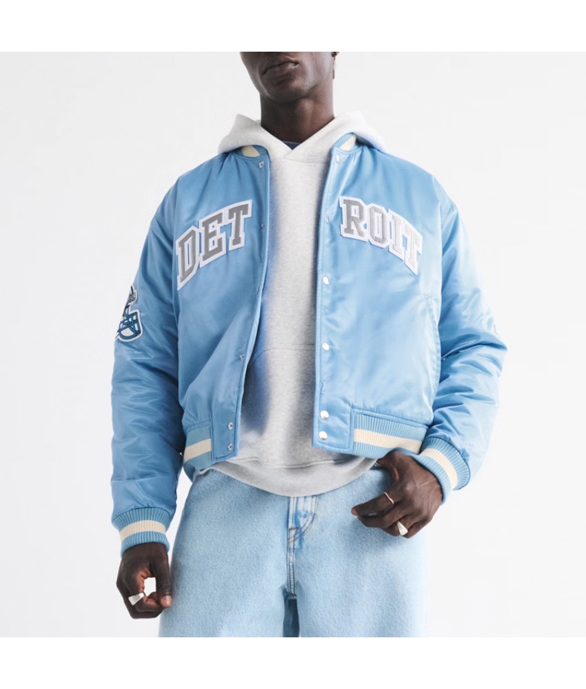 Detroit Lions Light Blue Varsity Bomber Satin Jacket