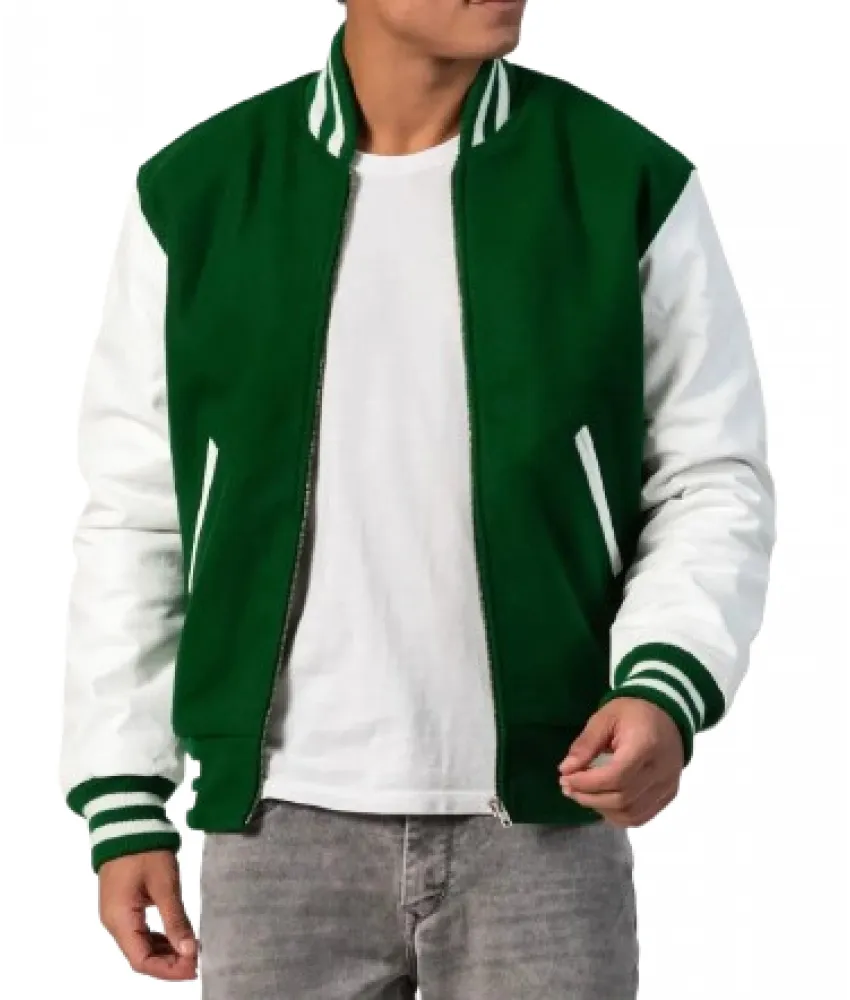 Kelly Green Wool Body & White Leather Sleeves Letterman Jacket With Zipper