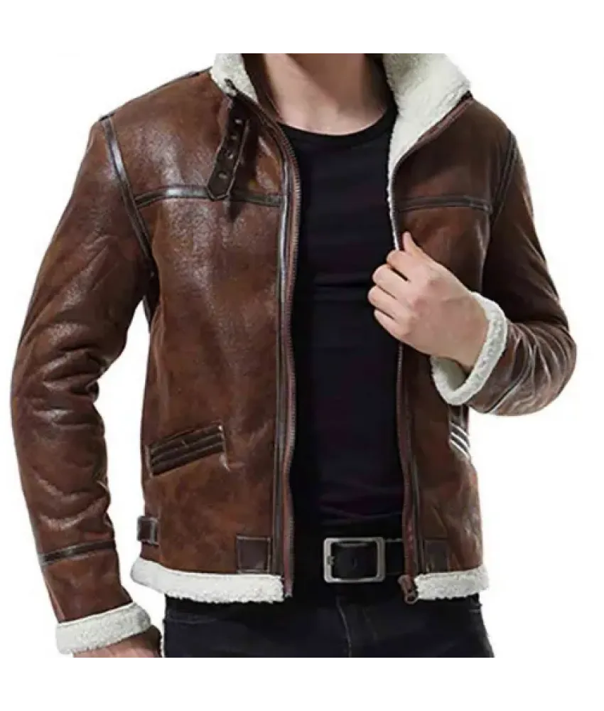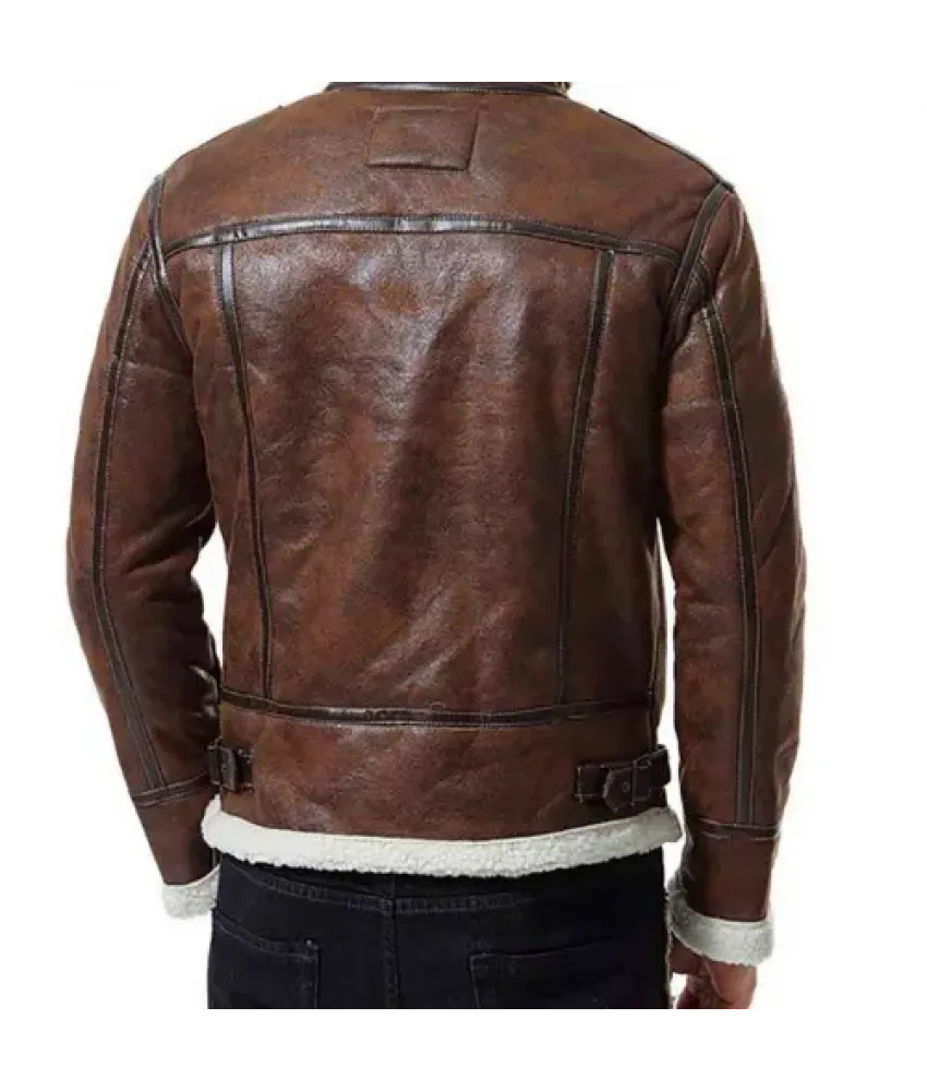 Men’s Biker Shearling Bomber Distressed Brown Leather Jacket