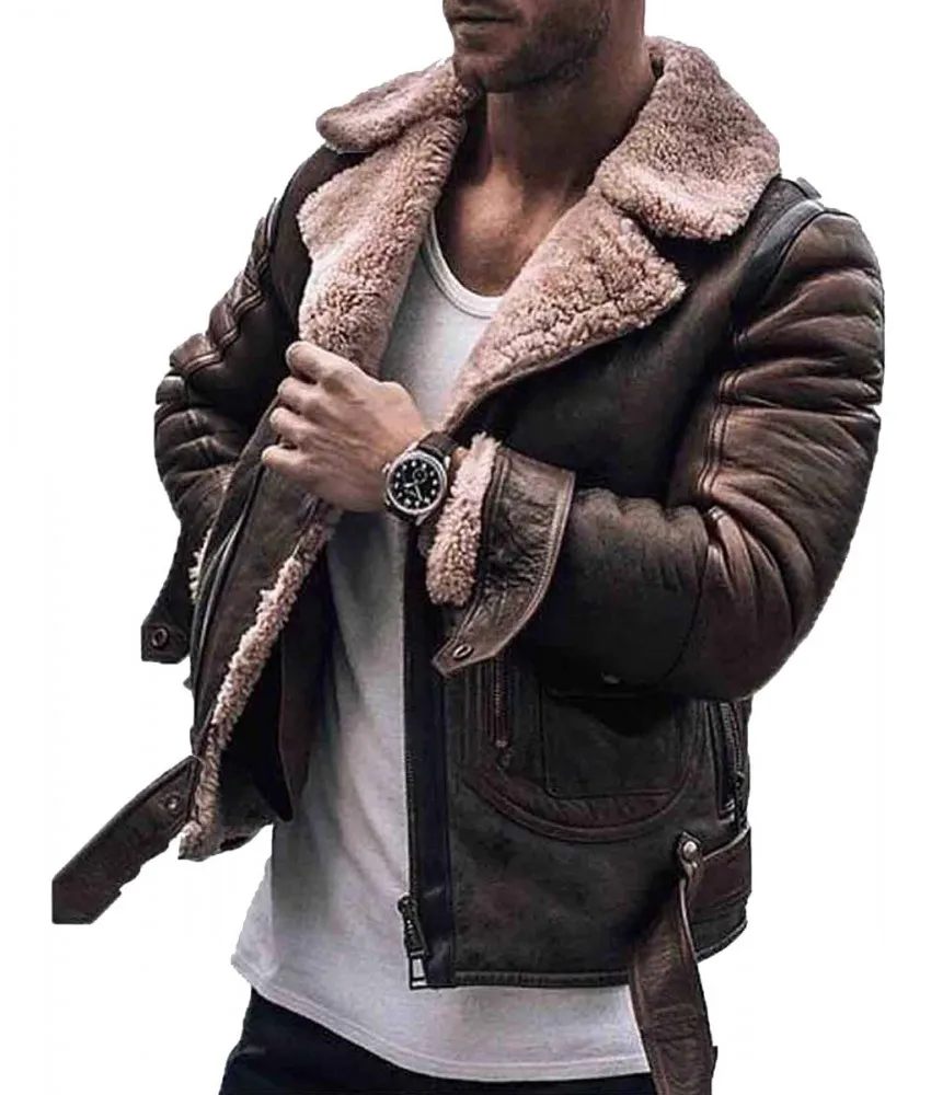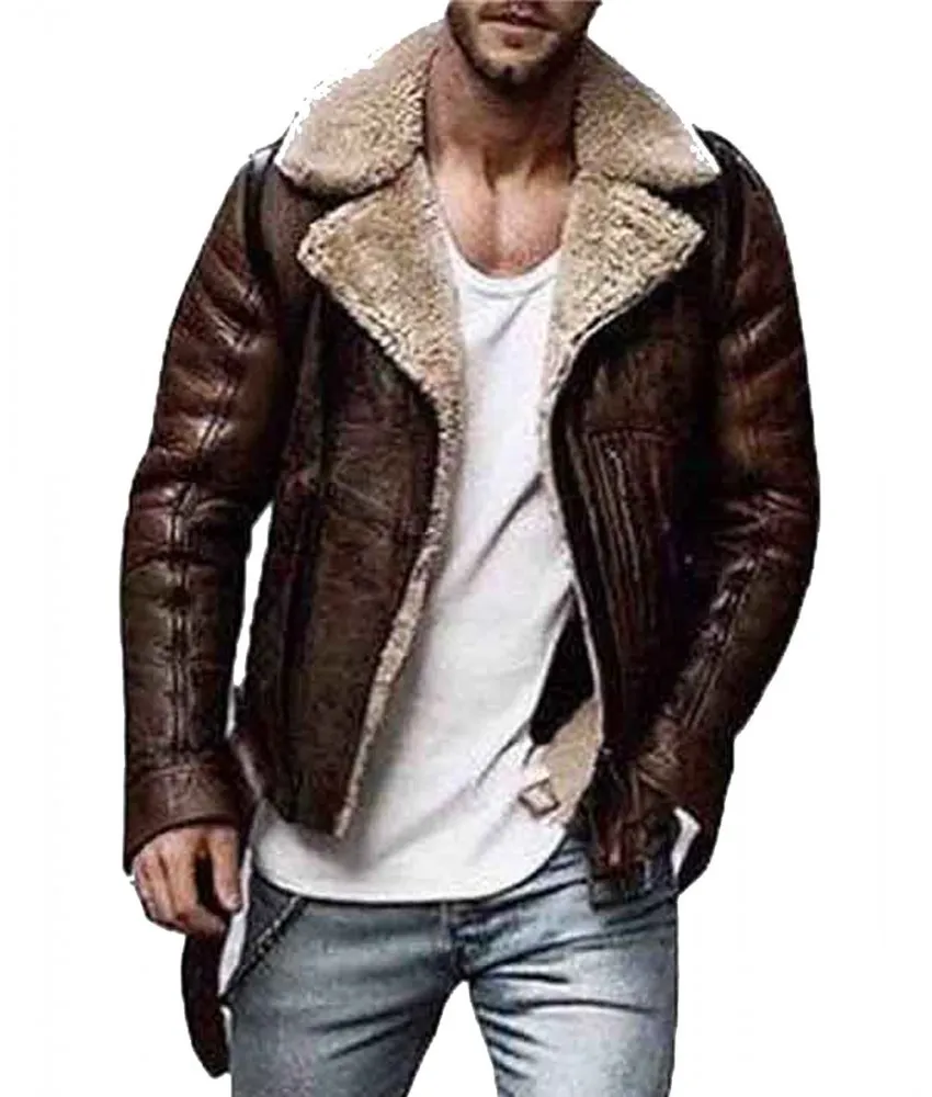 Men’s Street Style Brown Shearling Leather Jacket