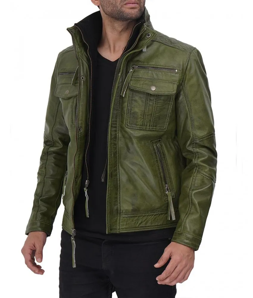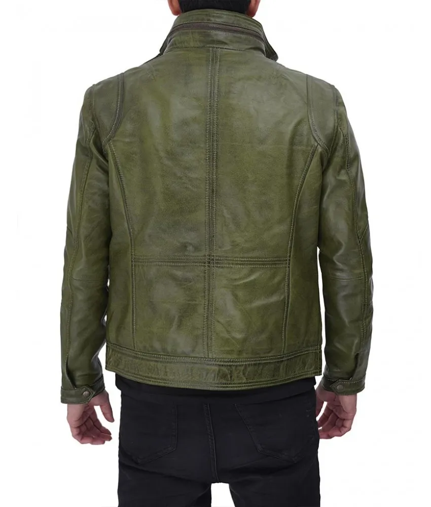 Moffit Distressed Dark Green Leather Jacket Mens