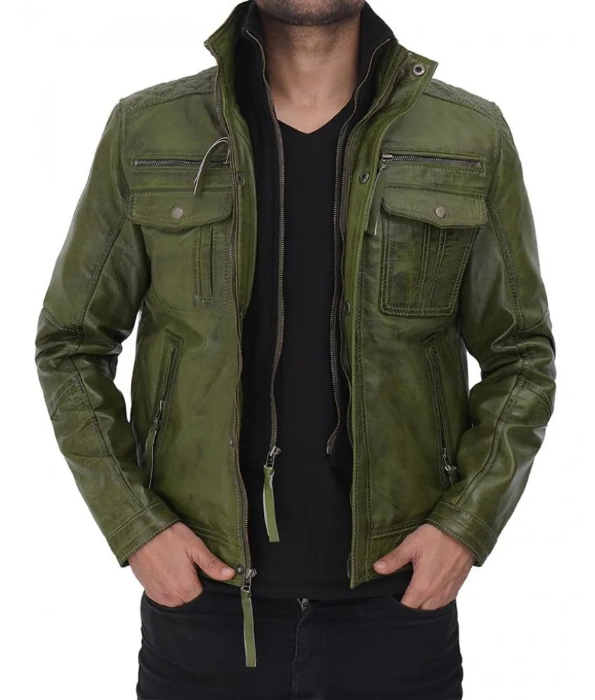 Keep your style unique for yourself and identifiable for others with the distinctive tone and distressed finishing of this dark green leather jacket men's. It’s made of real lambskin leather and comprises front zip closure, six functional outer pockets, two inside pockets, and one extra cell phone pocket.