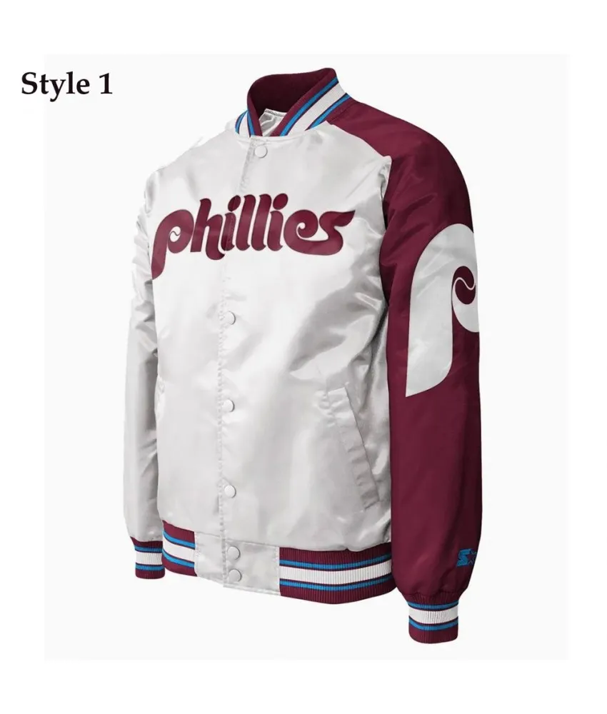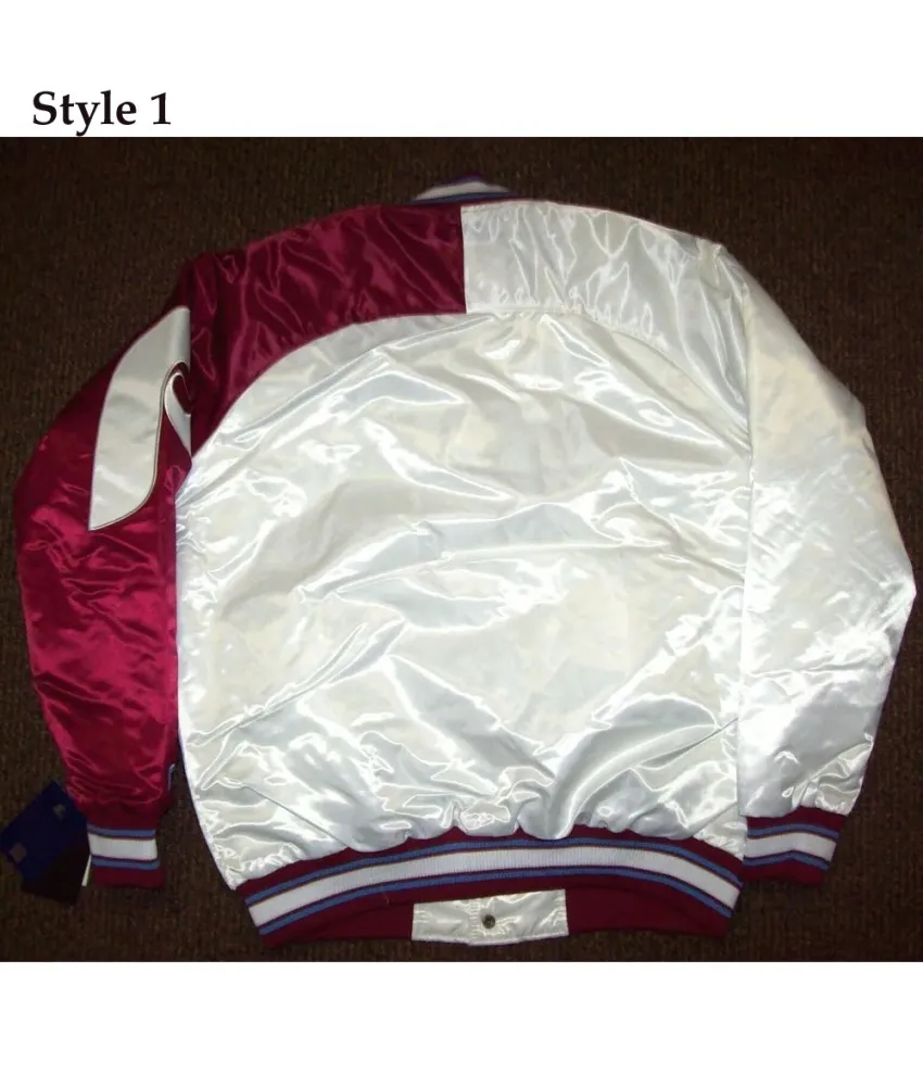 Tags: Letterman Jackets Wool Jackets Bomber Jackets Satin Jackets Varsity Jackets Philadelphia Phillies Purple and White Satin Jacket.