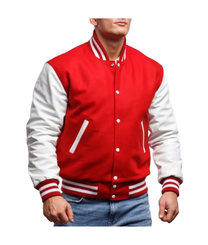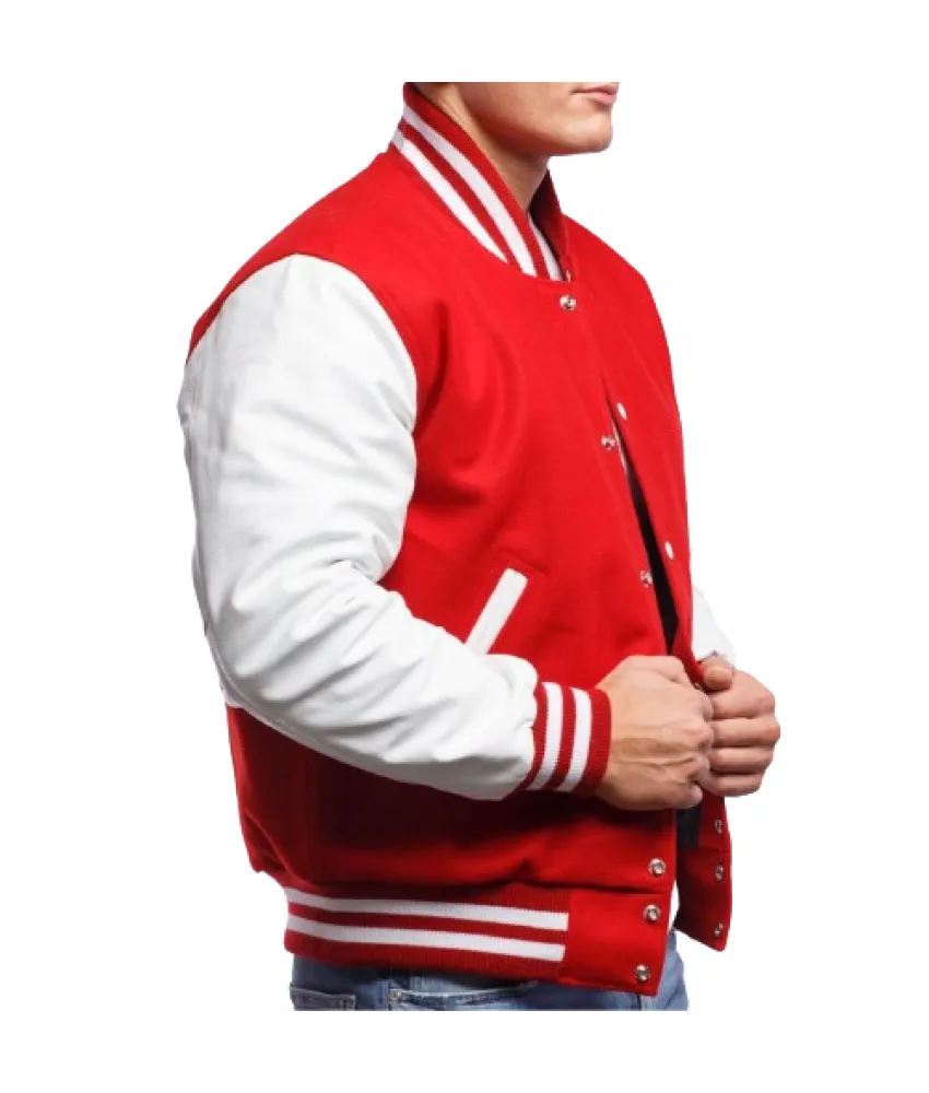 Design: Classic varsity letterman jacket with a stylish combination of wool and leather