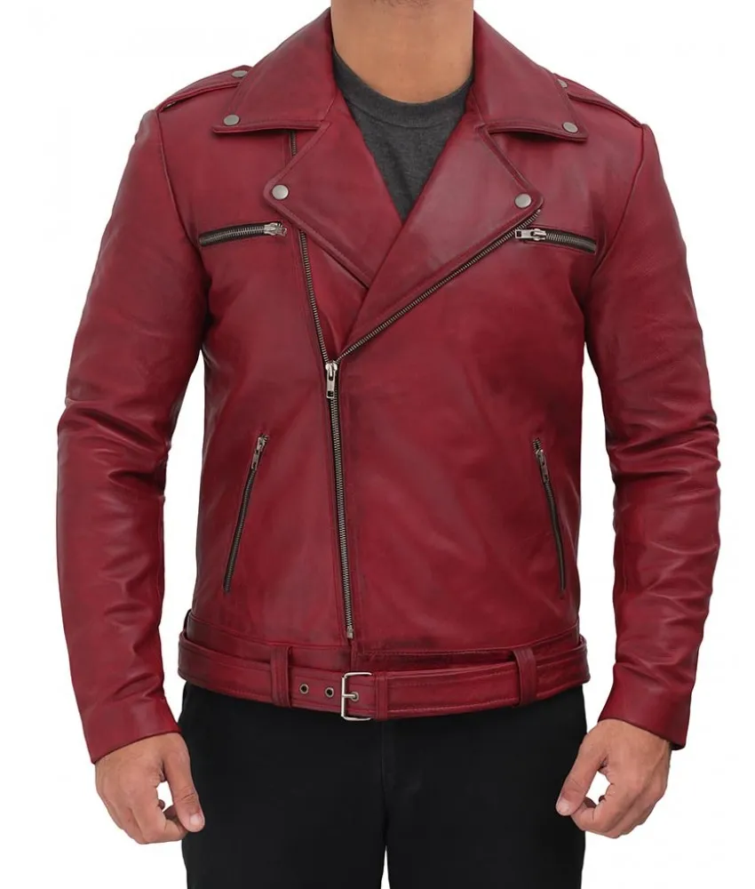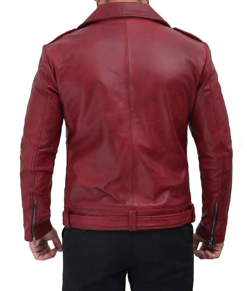 Stand out in the Maroon Leather Moto Jacket, a classy vintage inspired piece for men. Asymmetrical style collar, belted waist adjustment and exterior zipper pockets. Durable and made especially for riders which works as a shell to protect from wind - and you will look badass too!