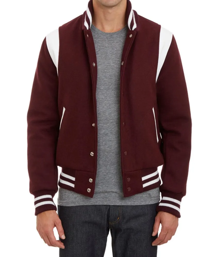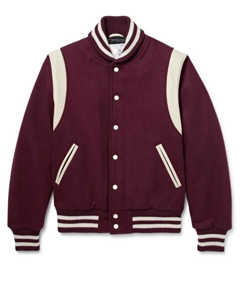 Tags: varsity jacket bomber jacket winters jacket Virgin Leather Trimmed Wool Bomber Burgundy Teddy Jacket