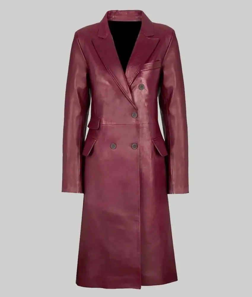 Zendaya Style Burgundy Double-Breasted Leather Trench Coat